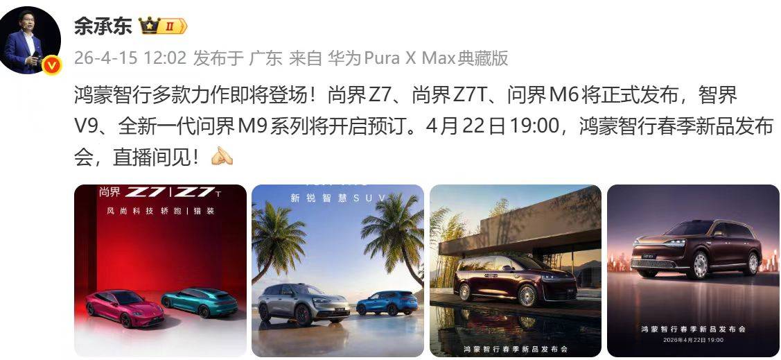 4月21日,新款乐道L90正式上市,一汽-大众ID.AURA T6以及JETTA X概念车亮相。4月22日更是将这波“错峰”推向了新的高度,鸿蒙智行春季新品发布会“五车齐发”,尚界Z7、尚界Z7T、问界M6三车上市,智界V9与全新一代同步开启预订。