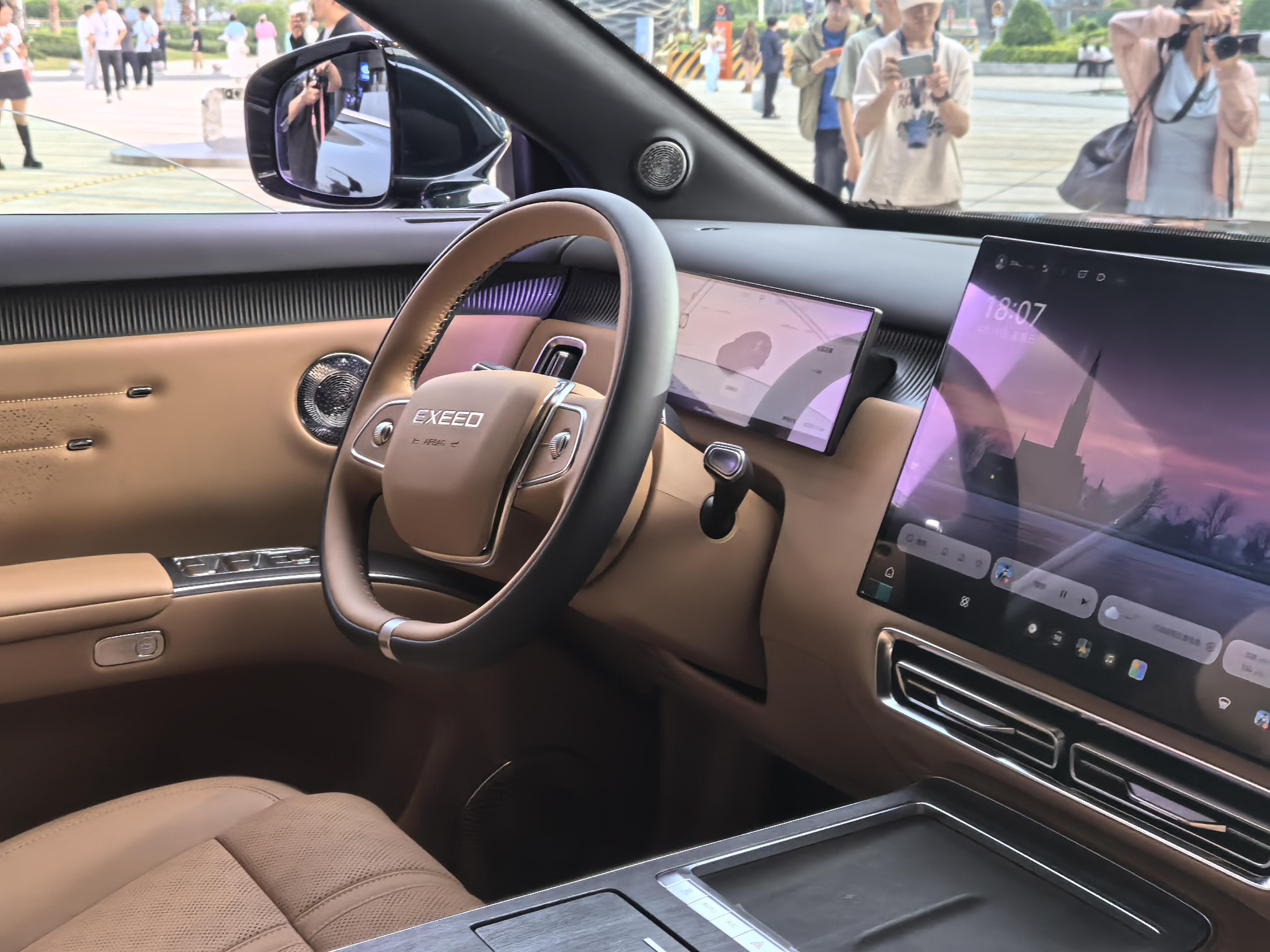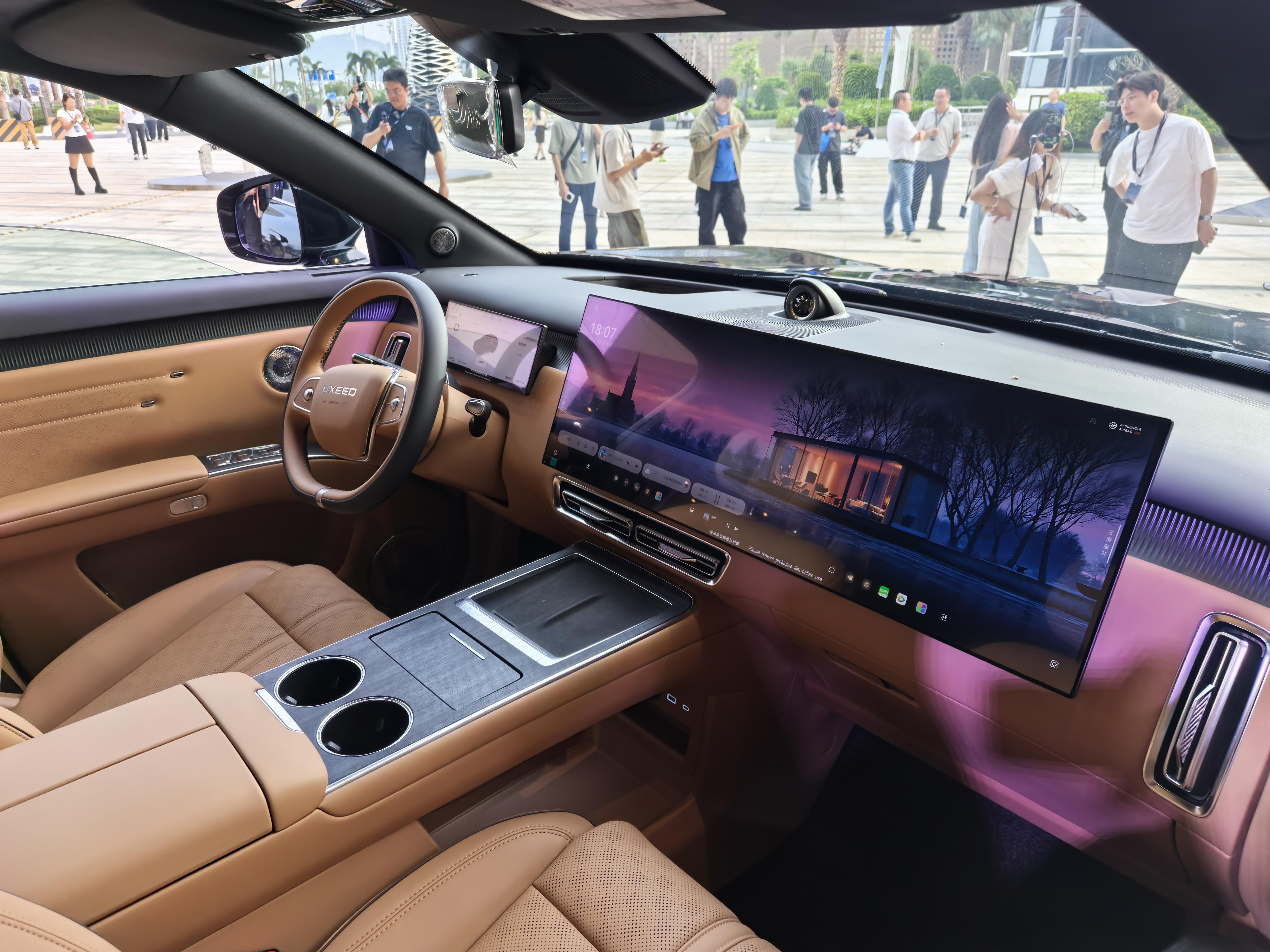 内饰最引人注目的是由中控屏与副驾屏组成的30英寸6K寰宇一体屏,屏占比达90%,峰值亮度1000nit。双辐式方向盘前方是悬浮式液晶仪表,副驾预计将配备零重力座椅。黑棕配色搭配全景天窗,整体氛围偏向简洁与科技感。