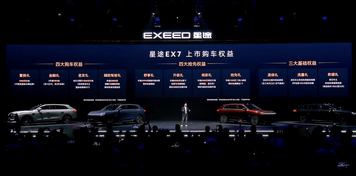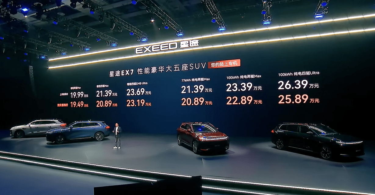网易汽车4月19日报道 4月19日,星途EX7正式上市,共6款车型,指导价19.99-26.39万元,限时置换价19.49-25.89万元。新车是星途品牌3.0时代的首款车型,定位中大型家用豪华大五座SUV,采用了全新风格的外观设计,并全系搭载了AI灵犀智舱2.0,动力方面则有纯电和增程两套动力系统。