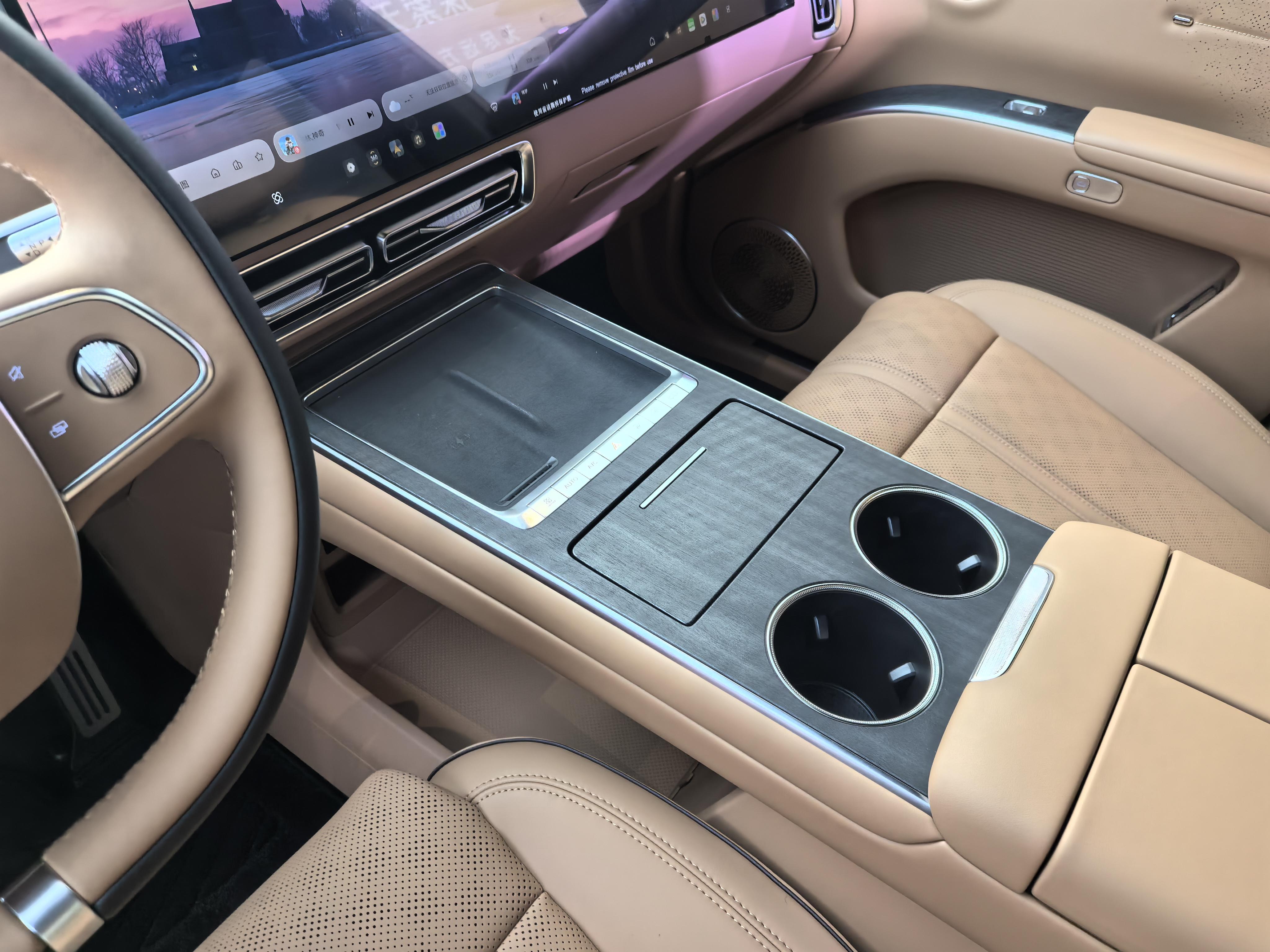 舒适性配置上,23扬声器的伯牙之音·雅音响(7.5.4.2全景声,峰值功率2880W)与9.2L智能冷暖冰箱(-18℃至50℃温域)提升了座舱体验。座椅方面,全车标配通风加热按摩,前排10点按摩后排8点按摩,并采用具备浅损自愈能力的\"自愈皮\"材质。